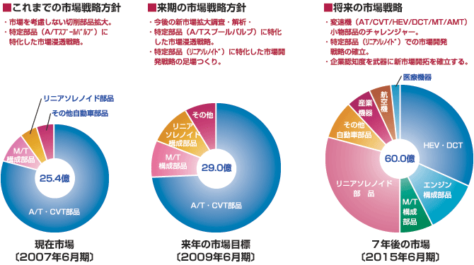 また2009年度にはエンジン部品にも積極的に取り組み受注獲得した。燃費向上を目的とした(OSV・VCT)等んp環境に配慮した製品にも着手していく。